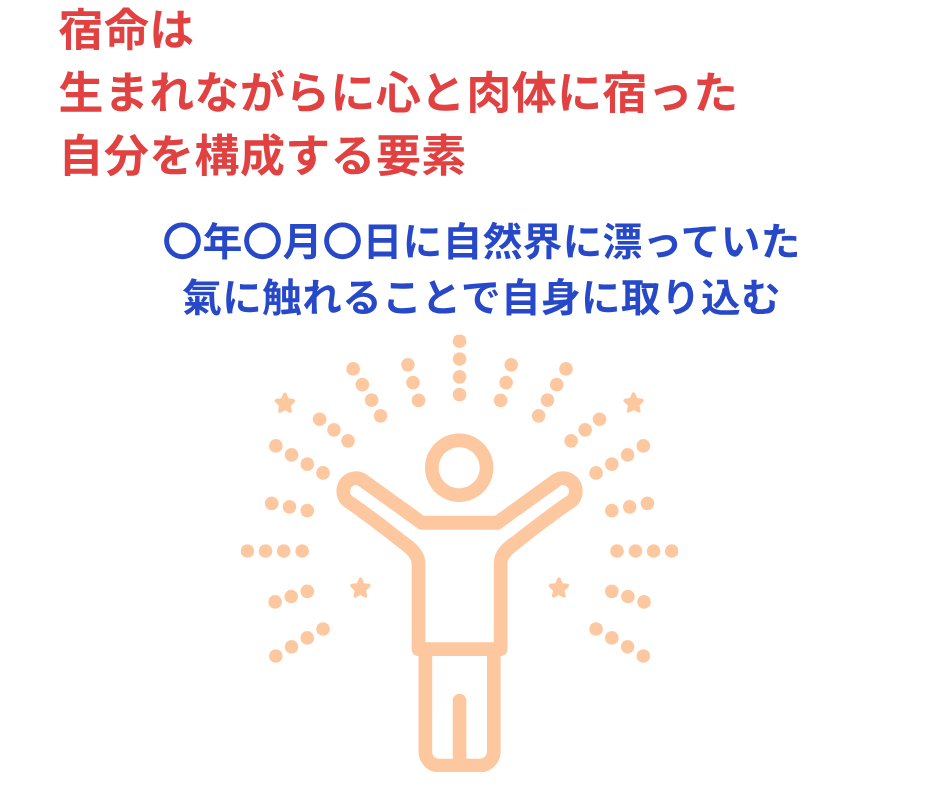 自然界に漂っていた氣と心の掛け合わせが生まれながらに備わるそれぞれの個性であり、生涯変わることの無い自身の宿命となります。