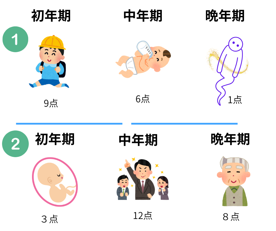 初年期が子供時代~30歳くらいまで(または親元を離れると稼働)