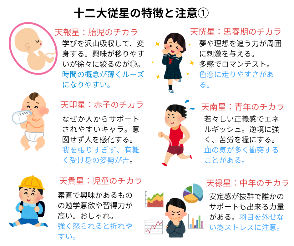 本日は算命学の十二大従星(じゅういにだいじゅうせい)を使って、人それぞれに任っている役割の違いを見て行きますよ。