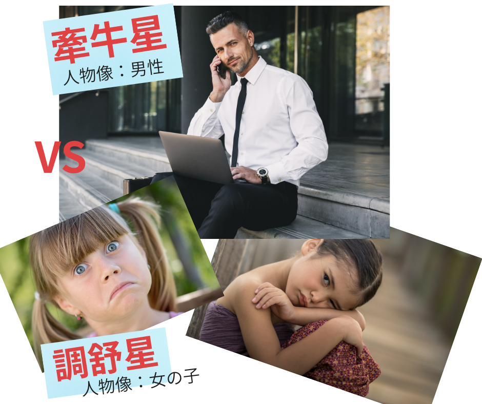 ①牽牛星:人物像は正夫・男・貴人 VS 調舒星:子供・女の子・目下