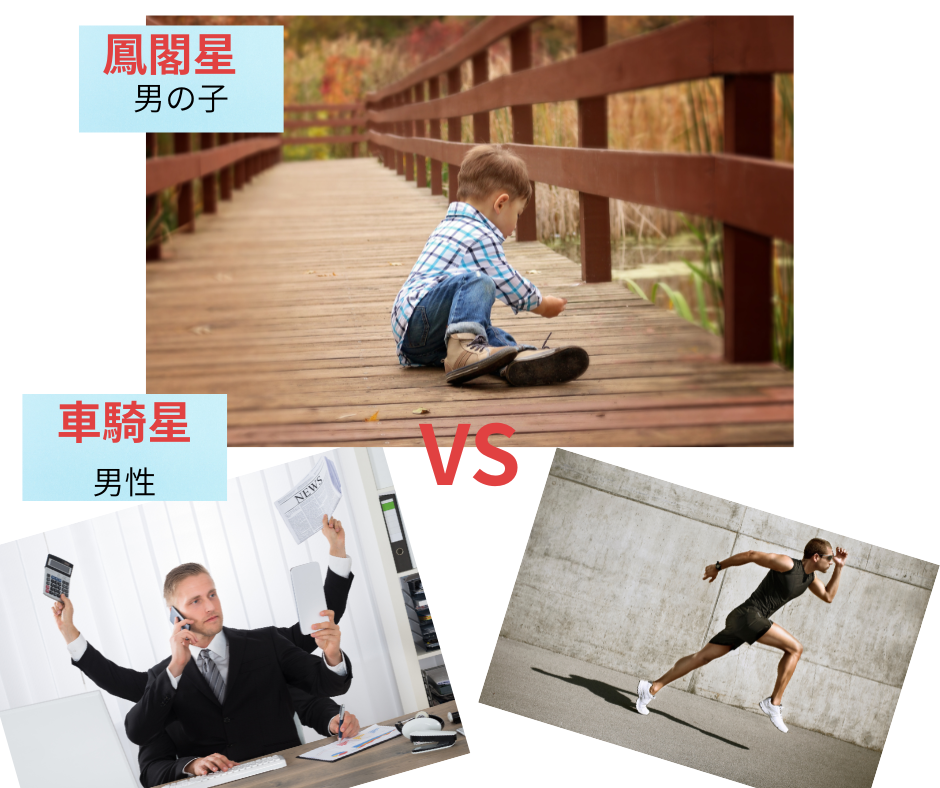 中心星と東西南北どれかに(東と西は見ない)鳳閣星と車騎星の組み合わせ。